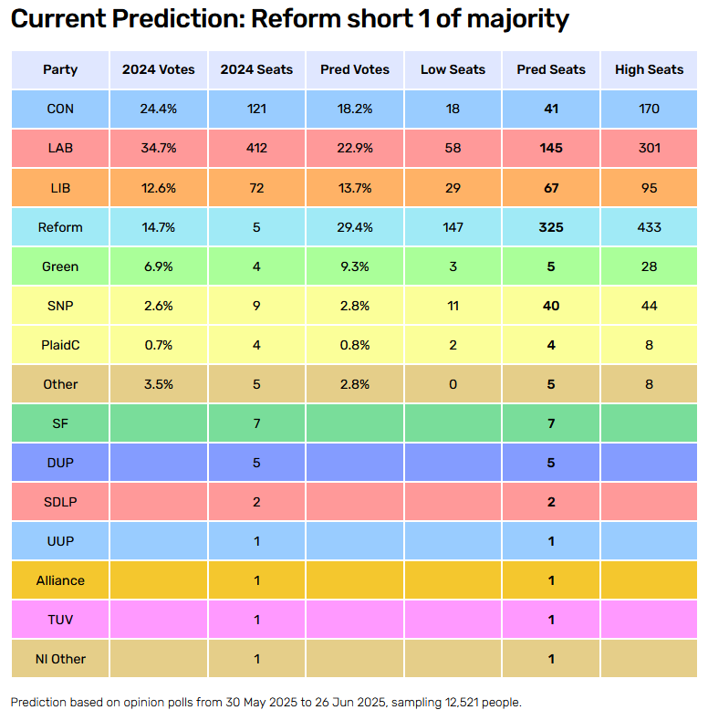 Electoral Calculus - July: Current Prediction: Reform short 1 of majority